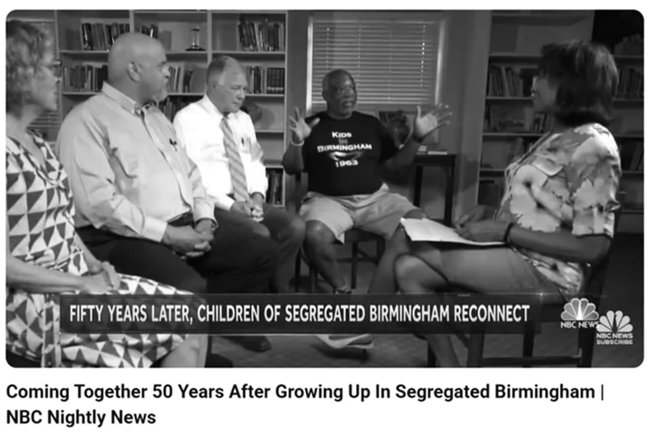 “The children who grew up in segregated Birmingham, Alabama returned home to tell their stories together, making connections that were strictly forbidden when they were growing up.” NBC correspondent Rehema Ellis says of the Kids Storytellers’ visits to local schools, “A powerful example for students—and the rest of the country.” Kids Storytellers Katherine Ramage, Jeff Drew, Chervis Isom, and Dale Long with NBC’s Rehema Ellis. November 2018.