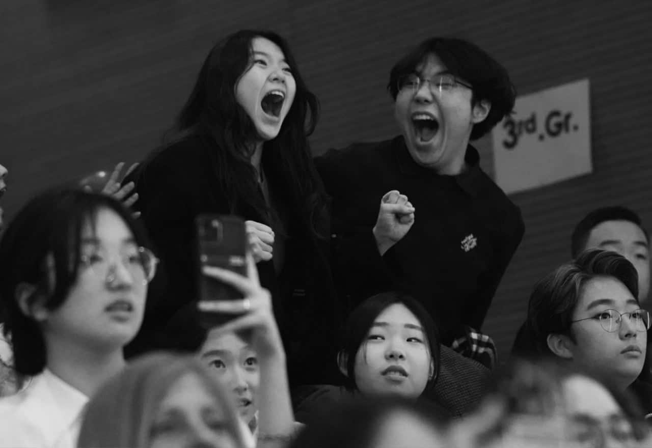 South Korean students Liwen Wang and Oliver Park react to news that they won first place for their National History Day project, a website they created on the Birmingham Children’s Crusade. They credit interviews with KIDS storytellers for helping them clinch first place. Photo by Esther Choi.